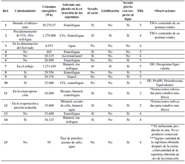 Las extracciones de las saponinas se pueden clasificar en dos categorías: las metodologías clásicas y las tecnologías verdes[11]. Las metodologías clásicas normalmente son extracción Soxhlet, extracción sólido líquido empleando grandes cantidades de solventes, mientras que las metodologías verdes emplean ultrasonido, líquidos ultrapresurizados, entre otros[12]. Otra alternativa para una extracción previa a una purificación es la mezcla de metodologías convencionales y tecnologías verdes; por ejemplo, realizar extracciones con solventes, evaporar empleando rota evaporación, redisolución en agua y liofilización, evitando que las características fisicoquímicas del extracto se vean afectadas[13]. En la Figura 1, se puede observar que el tipo de extracción utilizada por los investigadores se centra en métodos convencionales (con un 75%), aunque estos consuman grandes cantidades de solventes[11].