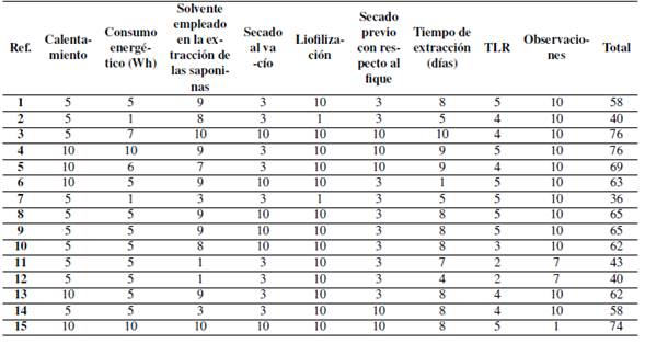 En la Tabla II, se observan los resultados de las consideraciones técnicas evaluadas para los diferentes procesos estudiados. En la Tabla III, se recogen las referencias bibliográficas para cada proceso. En la Tabla IV se encuentra la ponderación final de la matriz de decisión.
