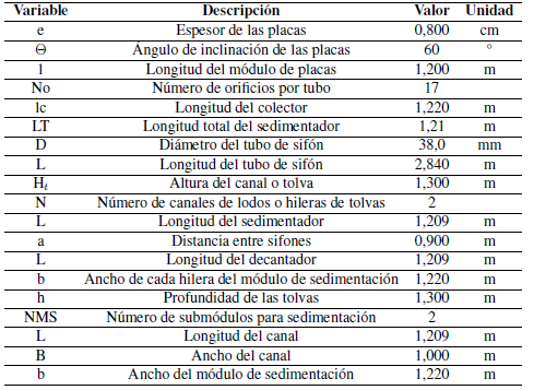 Para determinar el volumen sedimentado en el sistema PAC + jugo de fique, se mezclaron 400 mL de jugo de fique, 3.600mL de agua destilada y 120 gotas de PAC (4,9320g) generando vórtice por un minuto. El total se trasvasó a un decantador de 4.000 mL, donde se dejó en reposo por dieciséis horas hasta alcanzar el estado estacionario. Se determinó que el volumen sedimentado fue de 140 mL. El caudal de trabajo es 0,000187395 m3/s. En la Tabla V se muestran las dimensiones principales del sedimentador de placas siguiendo los cálculos de [75] y[76].