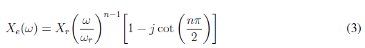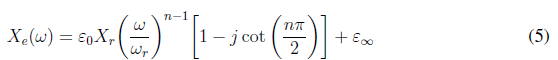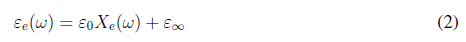 Donde εe (ω) es la permitividad dieléctrica compleja absoluta, [F/m], Xe(ω) es la susceptibilidad eléctrica compleja y ε? es la permitividad dieléctrica absoluta a alta frecuencia [F/m]. La susceptibilidad eléctrica compleja propuesta por Jonscher es definida por la ecuación (3).