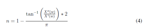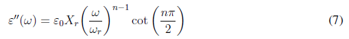 Donde Xr es la susceptibilidad eléctrica a la frecuencia de referencia, ωr es la frecuencia angular de referencia (ωr = 2πfr[rad/s]) y n es el nivel de pérdidas dieléctricas. Este último factor se encuentra en el intervalo de valores de 0 ? n ? 1 y se puede calcular mediante la ecuación (4).