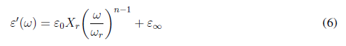 Durante el análisis, la frecuencia de referencia (fr en [Hz]) se elige arbitrariamente dentro de un rango cualquiera, el cual depende únicamente de la curva de dispersión del material que se quiera modelar matemáticamente. Esta curva de dispersión se obtiene evaluando la permitividad dieléctrica absoluta en función de la frecuencia del campo eléctrico incidente. De esta manera, remplazando la ecuación (3) en la ecuación (2), se obtiene en la ecuación (5), la cual define la permitividad dieléctrica compleja absoluta según el modelo de Jonscher.
