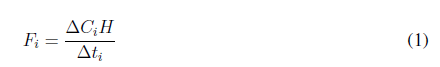 Donde Fi es el flujo en el intervalo de tiempo considerado (g/m2/d), Ci es la diferencia de concentración en el intervalo de tiempo considerado (g/m3), H altura de la columna de agua (m) y ti es el intervalo de tiempo entre las mediciones i yi + 1(d):