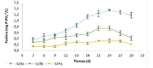 En la Figura 1 se muestra el comportamiento del fosfato en el agua para los tres tipos de suelos. Los resultados muestran un incremento en la concentración de PO3/4 en el agua contenida en el suelo S2RA que corresponde, a su vez, al suelo con mayor contenido de materia orgánica y fósforo disponible en su composición inicial y que, además, se caracterizó por una textura franco-arcillosa, situación que favorece los procesos de transferencia de nutrientes desde y hacia el medio. La menor concentración de fosfatos en el agua se dio para el suelo S3PA, lo que está relacionado con su textura arcillosa, la cual suele retener los nutrientes y no permite un adecuado proceso de intercambio suelo-agua.