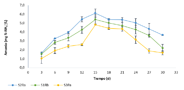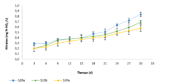 Lo descrito previamente se ve reflejado claramente en la Figura 3, donde la transferencia del nitrato es mucho más lenta que la de nitrógeno amoniacal y tiende a ser más estable hasta aproximadamente el día quince. A partir de esta fecha, se incrementa el proceso de transferencia por la disminución del oxigeno disuelto, lo que favorece las condiciones anóxicas, alcanzándose la máxima concentración de NO-3 al día 30 que fue la máxima experimentación.