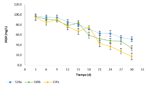 Finalmente, de acuerdo con el comportamiento de la DQO en el agua (Figura 4), se observa que esta disminuye su concentración durante toda la experimentación, indicando procesos de degradación anóxicos y anaerobios de la materia orgánica presente. Comparando los tres tipos de suelo se encuentra que la mayor degradación de materia orgánica se dio en el suelo S3PA, suelo de características arcillosas.