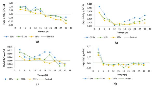 Se encontró que los tres tipos de suelo liberaron nitrógeno y fósforo (Figura 5), en función del gradiente de concentración que presentaron entre la columna de agua y el agua contenida en los poros del suelo. Este resultado está asociado con la mineralización de la materia orgánica y es similar a lo observado por [10]. Para el caso del amonio (Figura 5a), resultados de flujos fueron positivos hasta el día quince, con valores promedio de 0,0397 g/m2.d, 0,0450 g/m2.d y 0,0206 g/m2.d para los suelos S1RB, S2RA y S3PA, respectivamente. Posteriormente, los flujos fueron negativos, indicando flujos de amonio desde la columna de agua hacia los suelos, es decir, una retención de estos y en mayor proporción para el suelo S3PA, dadas sus características arcillosas. Este fenómeno corrobora lo encontrado en las concentraciones de amonio en la columna de agua, donde la cinética de transferencia disminuyó a partir del día quince. En el caso de los flujos de nitrato (Figura 5b), todos los flujos fueron positivos durante toda la experimentación, es decir, fueron desde el suelo hacia la columna de agua; sin embargo, en el día quince se evidencia una disminución de los flujos en los tres tipos de suelos, lo que coincide con los resultados de amonio y se asocia con procesos de desnitrificación posterior a los quince días por el agotamiento del oxígeno disuelto, lo cual favorece este proceso.