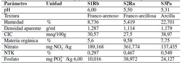 En la Tabla I se presentan las características fisicoquímicas de los tres tipos de suelo utilizados en los ensayos. De acuerdo con los resultados obtenidos, los suelos S1RB y S2RA se clasificaron como moderadamente ácidos, ya que presentaron valores de pH en el rango de 5,5-6,4 [23], [28], lo cual, según Campillo [29], está asociado con una deficiencia en las concentraciones de nitrógeno y fósforo. Por su parte, el suelo S3PA se clasificó como ácido por tener un valor contenido en el rango de 4,6-5,4 [23], [28] y de forma opuesta se puede asociar con un leve incremento en la concentración de estos nutrientes. La medida del pH es fundamental en la caracterización de los suelos debido a que este parámetro afecta la disponibilidad de nutrientes, la actividad microbiana y la toxicidad asociada a ciertos metales en forma disuelta.