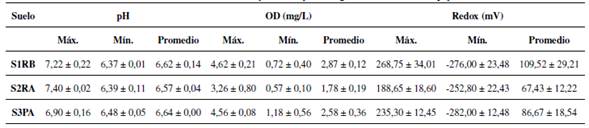 En la Tabla II se encuentran los valores máximos, mínimos y promedios para las variables de pH, oxígeno disuelto y potencial redox, los cuales se obtuvieron a partir de las mediciones realizadas en la columna de agua en los ensayos en batch. En general, para los tres tipos de suelo no se presentaron grandes fluctuaciones en el valor del pH, teniendo un valor promedio de 6,61 ± 0,05 para todos los experimentos. Por otra parte, las concentraciones de oxígeno disuelto (OD) variaron durante el experimento, pero de acuerdo con los valores promedios obtenidos para los tres tipos de suelo, lo hicieron alrededor de las condiciones anóxicas (1,78 mg/L - 2,97 mg/L). En forma general, el OD fue disminuyendo a lo largo del periodo de análisis, situación debida a la demanda de oxígeno ejercida por la degradación de la materia orgánica presente en los tres tipos de suelo. Sin embargo, como el suelo S2RA registró un mayor contenido de esta, sus valores de OD medidos fueron más bajos respecto a los otros suelos. En cuanto al potencial redox, los valores fueron positivos al inicio de los experimentos y luego negativos durante el transcurso del periodo de estudio, alcanzando valores mínimos de -274,00 mV para S1RB, -252,80 mV para S2RA y -282.00 mV para S3PA.