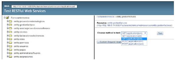 Considerando los requisitos funcionales, se establecen los comportamientos deseados del aplicativo Factura ElectrónicaWeb, los cuales fueron traducidos en especificaciones técnicas utilizando el lenguaje de descripción de aplicaciones web (WADL) utilizado por la herramienta Netbeans, que permitió desarrollar la construcción del servicio web RESTFul. Este permite escoger el método (GET, utilizado únicamente para consultar información al servidor, o POST, utilizado para solicitar la creación de un nuevo registro) y el formato (XML, un lenguaje de marcado extensible, o JSON, un formato ligero de intercambio de datos) para la consulta o ingreso de datos de la aplicación (Figura 8).