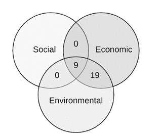 We found 19 articles about modeling with environmental and economic actors, 9 of which include the three pillars: social, environmental and, economic. However, none of them had a solely socioeconomic or social-environmental focus. [97] did not find either any model that considered only the social environmental aspect; but they found 3 articles that considered the socio-economic aspect. Similarly, [10] found 28 articles with the three pillars, 61 with environmental-economic, 2 with social-economic, and 1 with social-environmental approaches.