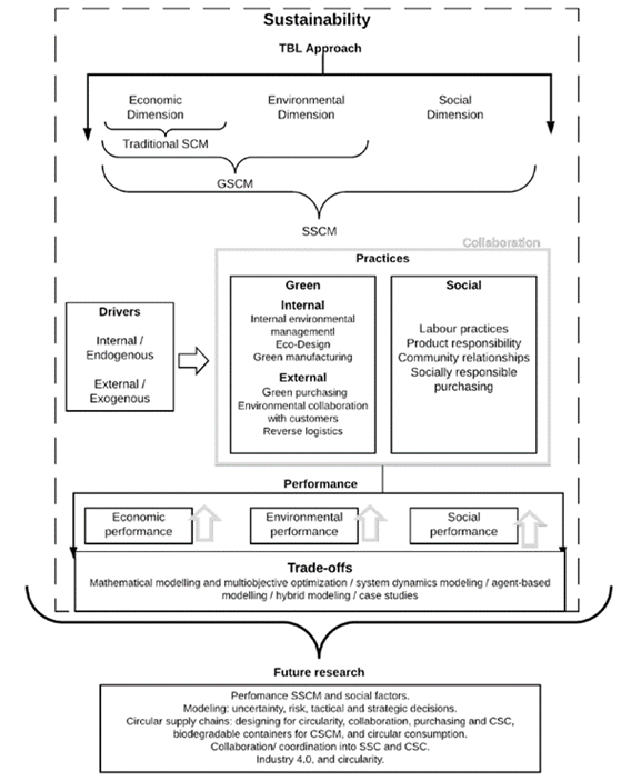 In Fig. 3, there is a synthesis of the findings of the literature review. Firstly, we found, from the sustainability perspective, how the TBL offers an approach from the 3 dimensions or pillars which has been covered in by literature in traditional SCM, GSCM, and SSCM, with external and internal motivators that drive the manufacturing structure and include sustainable objectives. In the same way, these motivators drive the deployment of social and green SC practices, where it is important to highlight collaboration to involve the parties and to have an impact in SC development. In addition, trade-off are found in the decision-making process within the context of SCs and sustainability, an approach that has raised interest among researchers.