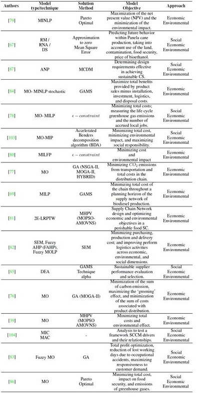 In the field of mathematical programming, mathematical multi-objective programming models stand out by aiming to minimize the total costs and carbon emission [75] - [77], linear models [69], [78], non-linear [79], fractional [80], routing [81].To have a better approach to reality, modeling a series of fuzzy [82], [83], and stochastic variables have been included [84]. Related to their functions and objectives with social factors, we found models that maximize the number of employees [78], evaluate suppliers [85], reduce workdays lost due to work accidents [83], and maximize food safety [86]. Similarly, [87] proposed multicriteria decision methods and structural equations modeling (SEM), aiming to maximize the total value of sustainable purchase performance and partial least squares SEM (PLS-SEM), which facilitate the development of sustainable SC practices and have an effect in competitive advantage [21]. Some solution methods used " constraints to solve multi-objective models [78], [80] , as well as using Pareto optimality [79], [86], GAMS software [85], [84], hybrid multi-objective approaches [81], and genetic algorithms [83], [77].