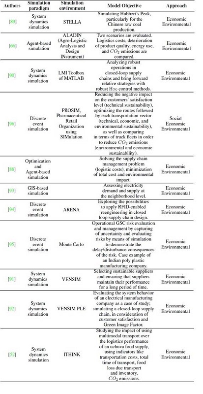 [52] simulate and study the use of multimodal transportation on the performance of the food supply logistics of uchuva SCs through the system dynamics approach. They consider transportation costs, total transportation time, food loss due to transportation and inventory, and CO2 emissions caused by mode of transportation. [92] simulate and evaluate sustainability in a closed supply chain, considering customer satisfaction and impact and the green image factor as an environmental factor. [93]use simulation based on GIS (Geographic Information Systems) to evaluate electric demand and supply at the neighborhood level through discrete simulation, seeking to reduce the negative impact on customers satisfaction levels, as well as the way to optimize routes and compare sevarl solutions in terms of truck fleets to reduce CO2 emissions. [94] explore the possibilities of applying the reengineering process available with RFID in closed cycle SCs, and [95], also using discrete simulation, analyze the consequences of risk in terms delay/disturbance using the Monte Carlo Simulation.