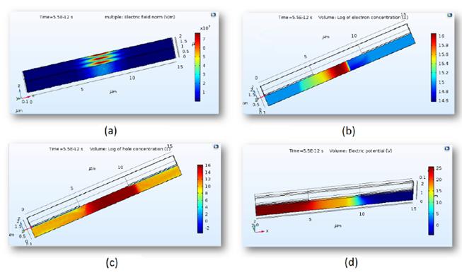 Then, the design of the PCA is simulated, observing the concentration of the electric field in the gap zone of the dipole (Fig. 8a), the concentration of electrons in the gap zone on the semiconductor substrate closest to the dipole anode (Fig. 8b), the concentration of holes with higher gap intensity of the distributed dipole in most of the semiconductor substrate (Fig. 8c), and the concentration of electric potential in the antenna’s anode and the semiconductor substrate given by the incident beam (Fig. 8d).