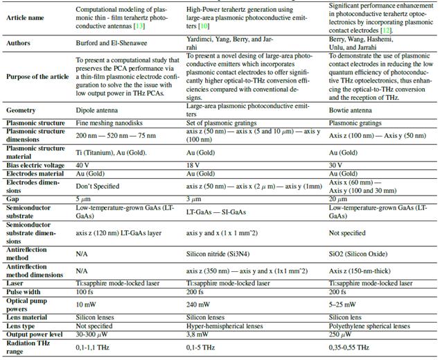 The objective of Table I is to present a compilation of various authors regarding the optical conversion to THz, the geometry of the antenna construction, the type of plasmonic structure, the gap space, the characteristics of the laser, the semiconductor substrate, the polarization voltage, and the dimensions and type of lens, in order to understand what is the response produced by each of the parameters of a PCA and their influence on improving the design and output power.