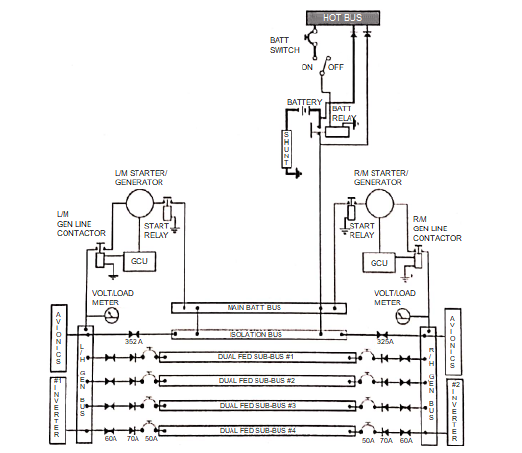The Engine-Generators are controlled by the GCU. These units are located in the front of the aircraft, specifically below the main mast aisle. During normal operation, each voltage regulator monitors the engine-generator’s voltage output and controls the produced electromagnetic field to maintain a constant load under variable operating conditions such as changes in speed, voltage, and temperature of each motor.