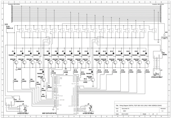 In accordance with the information above, the parameters and electrical characteristics that the digital bench should carry were established, and the type of relay that replaces the manual selection of channels by the operator was selected. Likewise the type of microcontroller that controls the opening or closing of measurement channels was determined; the EXP432P401R microcontroller was selected, and two independent channels were established for voltage and resistance collection, according to the procedure defined in the GCU maintenance manual. The layout of the circuit diagram can be seen in Fig. 4.