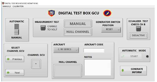 Therefore, the design of a digital portable bench was proposed for the GCU troubleshooting tests of this aircraft series. This device would automatically select channels, test the GCU, interpret the acquired information, and generate technical reports of the tests, with the support from a server belonging to the Aircraft Maintenance Battalion. The bench reduces the fuel consumption, time, and personnel required to carry out the test, in addition to improving the technical personnel’s occupational health and safety by standardizing and optimizing maintenance processes and improving the traceability of GCU inspection processes.