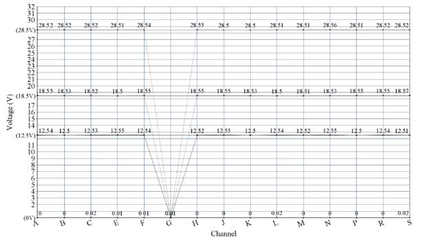 The ATA manual states that the voltage measurement ratio for the GCU troubleshooting process is 1% or 0,01 V. According to this parameter, the test bench complies with the measurement (0 V,12,5 V, 18,5 V, 28,5 V) and resolution parameters established by the manufacturer. Additionally, the voltage measurement acquired by the bench is compared with a voltage source (10894 calibration certificate (MPL3303 S / N D02200602982)) with a digital voltmeter (10794 calibration certificate (ET-2907 S / N 80200239)), with calibration certificates of less than one year, thus validating that the measurement is within the expected real parameters. In Fig. 9 the control graph of the voltage results from taking protocol for 4 measurement standards clearly the Ground Channel G has 0 V.