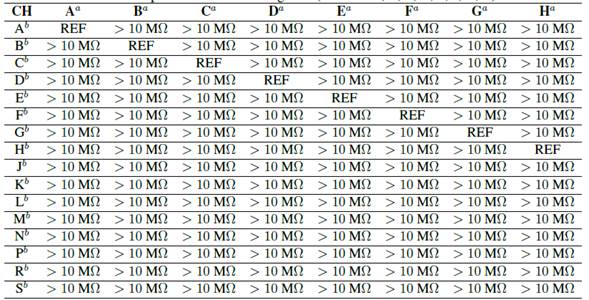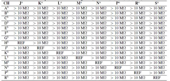 Table III shows the impedance values greater than 10 M for each of the channels when the references (REF) are J, K, L, M, N, P, R, and S. The rest of channels must be in open circuit.