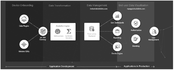 Regarding the presentation board, data can be analyzed in real time because the platform creates pictures. Therefore, the devices and the information they collect can be controlled. Additionally, the platform has a user management feature, which helps organize permissions and restrictions depending on the operator or end user. Other features are sensor communication (input/output), API creation, extended monitoring, and data analysis of API applications of all kinds. On the other hand, its data storage depends on the acquired plan, back-end possibilities, and daily visualization of the stored data. The data output is called scheduled reports and is delivered in PDF or Excel formats. A delivery can be scheduled for anyone who needs it. In Fig. 3, the different services offered by the Ubidots platform are shown [10].