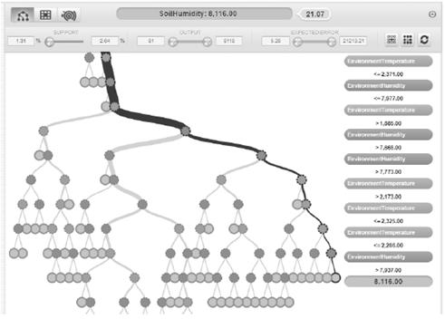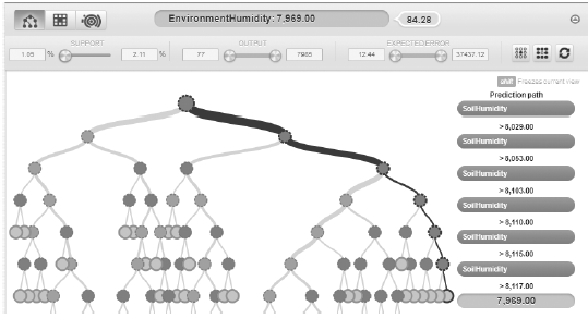 Applying the supervised model with classification through decision trees, we were able to establish that, as the environmental humidity increases, the number of instances decreases, and the soil humidity remains up to 79,69 %. In conclusion, if the humidity of the environment increases, the soil moisture tends to decrease. In Fig. 7, we can see a decision tree taking the environmental humidity variable as a pivot.