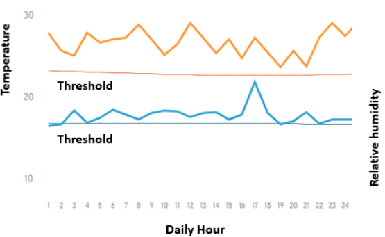 A training model was executed for the reference dataset, which was measured for 24 hours, as can be seen in Fig. 9. The measurements were made every 10 minutes and an average of 6 measurements was obtained every hour. Once the appropriate parameter was determined by homogenizing the data, the percentages for temperature and relative humidity were compared. According to the ML training, it was found that the greater number of instances in the temperature variable indicates that, if the ambient temperature increases, then the relative humidity tends to decrease. This means that both variables are inversely proportional. Therefore, the system would indicate that it is necessary to water the crop, since the relative humidity must be over a 75 % threshold.