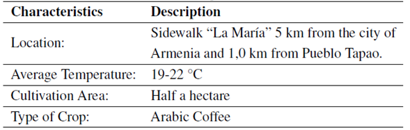 The implementation of the WSN will be carried out in a 300 m2 area of a coffee crop in El Cortijo farm, located in the town of Pueblo Tapao, a district of Armenia (Quindío). Table II shows the description and physical characteristics of the terrain.