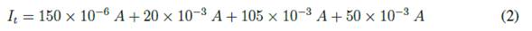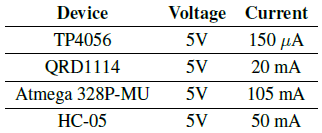 Below, the calculation of the total power consumed by the system is presented in Equations (1) to (4), for which it must be considered that the system generates a load for its operation which depends on the current or power required by each one of the elements of the system, where IP represents the current consumed by the device with reference TP4056, IQ represents reference QRD1114, IA represents Atmega 328P-MU, and IH represents reference HC-05.