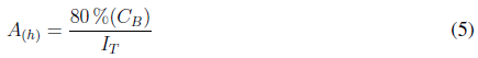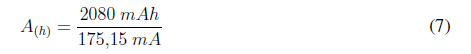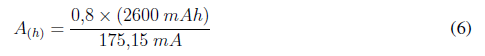 Having determined the current consumed by the device, its autonomy can be estimated, considering the fact that, to maximize the useful life of the battery, discharges below 80% of its maximum capacity (2.600 mAh) should be avoided, so the battery can only supply 4/5 of its capacity, that is, 2.080 mAh. In Equations (5) to (8), the calculation of the autonomy of the device in hours is represented by variable A(H), and the capacity of the battery is represented by CB.