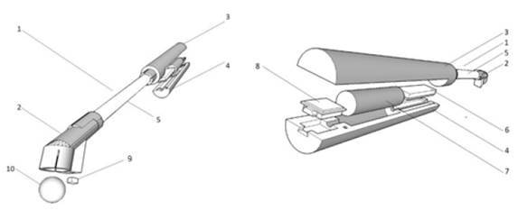 Figure 3 shows the 3D design of the electronic baton (1) made with a free version of the Sketchup application. The electronic baton consists of a 1 cm diameter aluminum cylinder (5), which connects one of its ends with the sliding tip (2), inside the sliding tip is the infrared light sensor (9), positioned at a maximum height of 5 mm. This distance is justified by operation requirements of the sensor. The sliding tip also contains a 1 cm diameter (10) sphere that facilitates movement with the cane and is self-contained in the sliding tip that surrounds 66,6% of the volume of the sphere, allowing the sphere to rotate freely in all directions while remaining fixed on the sliding tip. The opposite end of the aluminum tube connects the handle of the cane (3) that contains the electronics, which is joined with the cover of the handle (4). This joint is fixed by coupling screws, forming three cavities inside of the cane handle, where the recharge control system (8), the rechargeable battery or FEM (7), and the electronic control circuit (6) are located. This arrangement allows to connect both circuits to the FEM easily, using less wiring and allows containing the different electronic components within the handle of the cane, which results in the size of the handle of the cane being comfortable and practically the same as those commonly used by the blind population.