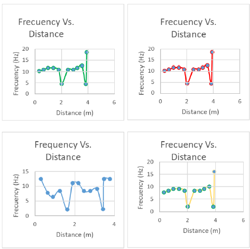 From Figure 6, it can be seen that there are differences in the distance vs. frequency with which different users move the cane from side to side. Additionally, these frequencies do not appear to be constant. By carefully observing all the graphs, it is made evident that there are important peaks in which said frequency drops notoriously. This is due to the fact that, on the test route, there were potholes on one side of the guiding line, near the 2 and 4 meter marks.We decided not to repeat the test under ideal conditions, since the existence of these potholes represent the possibility of having unforeseen events along the routes and present an opportunity to validate the operation of the cane in the presence of imperfections. Therefore, using the frequency with which the user moves the cane from one side to another in order to determine if it was following the guiding line was no longer a possibility, as it had been originally planned. This first observation forced a design change in the way it is verified whether the user is following the guiding line. It goes from detecting an average frequency of movement of the cane and generating a short audible beep when the instantaneous frequency of movement of the cane mat the average frequency, to just detecting the guiding line and generating a short audible beep each time the sensor passes over the line.