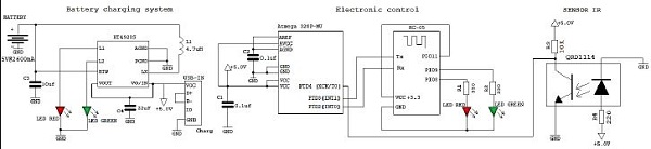 Figure 4 shows the block diagram of the modules that make up the electronics of the device. It has a recharge control system, composed of an integrated charge management module (reference TP4056) [8], a FEM composed of a lithium-ion battery rechargeable, an electronic control circuit composed of an Arduino module with a microcontroller (Atmega reference 328P-MU) [9], a signal conditioning module that provides the infrared light sensor, a wireless connection module (reference HC-05) [10] that allows communication between the microcontroller, and the mobile device that contains the orientation software application. Finally, the module composed of the infrared light sensor (reference QRD1114) [11] is located at the tip of the cane.