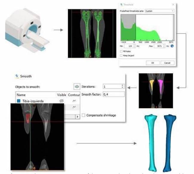 Conclusiones: Las superficies reconstruidas son más suaves cuando se utiliza Mimics a pesar de que se utilizó el mismo factor de suavidad en ambos programas durante la reconstrucción. Cuando se utilizan 16 cortes (retenidas cada 16 imágenes del modelo original completo), las diferencias de distancia aumentan para ambos huesos (tibia y peroné). Para el RMS, reducir el número de cortes y utilizar cualquiera de los dos programas analizados no presentaría diferencias significativas en la reconstrucción planteándose como una forma potencial para la reducción de la exposición a la radiación del paciente.