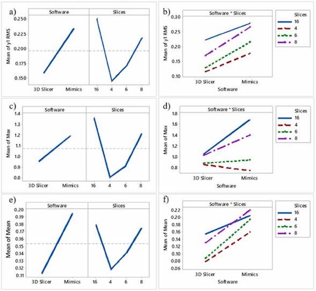 Figs. 2a and 2b show the Mean effects and interaction plots, respectively. As observed, 3DSlicer has lower RMS values than Mimics, and the higher RMS was noticed with the 16 slices. However,from the p-values, software (p = 0,07), slices (p = 0,24), and the interaction between software and slices (p = 0,97) are not significant for the RMS response. On the other hand, the highest mean value was observed for the model with 8 slices (Figs. 2e and 2f). However, slices (p = 0,56) and the software-slices interaction (p = 0,95) are not significant for the response. Nevertheless, software (p= 0,046) significantly influences the response, and 3DSlicer had a lower Mean value than Mimics.