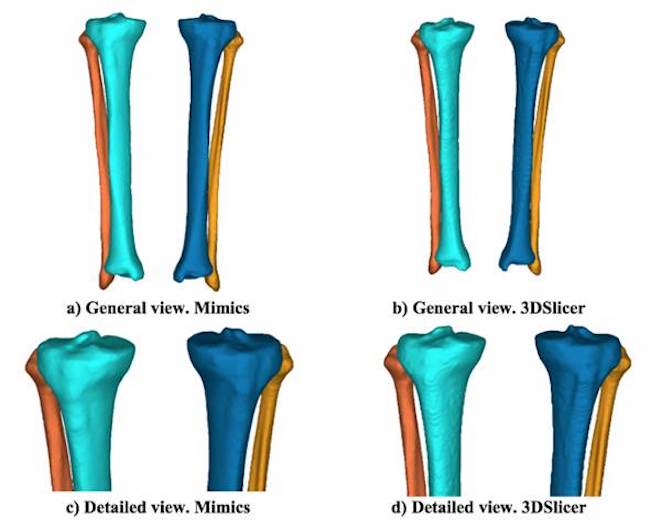 As mentioned above, the first step to developing a biomechanical model is reconstruction using a 2D stack of tomographic images in a medical image analysis software (such as Mimics or 3DSlicer). Previous reports [16] have found minimum differences when the reconstruction is carried out using different free software applications, which obtained bone models of good quality. The authors postulated that freeware is suitable for 3D bone model reconstruction. In this work, a commercial (Mimics Research 19.0, research license) and free software (Slicer, version 4.11) were included in the analysis to study the offer of computational tools and their compliance with quality standards This paper aims to evaluate the configurations used for 3D reconstructions in the tibia and fibula for applications in biomechanical fracture models. This evaluation includes the advantages and disadvantages of two software applications, as well as the number of slices required for quality reconstruction, aiming to reduce the potential exposure dose to radiation.