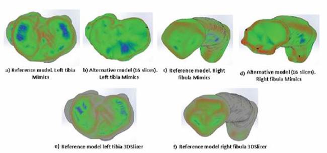 Figure 5 shows the curvature analysis for the left tibia and right fibula alternative models, as well as the reference models using both Mimics and 3DSlicer. The greatest curvature value displayed is 1, and the smallest one is 0,0010. As the radius of curvature decreases, color changes from black (0,0010) to blue, green, and red (1,0000). As the radius of curvature increases, the curvature value decreases. A planar surface has a curvature value of zero because the radii of flat faces are infinite.The results showed that there are no noticeable differences between the reference model and the model reconstructed using 4 slices (not shown). However, when 16 slices are used to reconstruct the alternative model, the curvature (and the continuity) of the surfaces is affected.