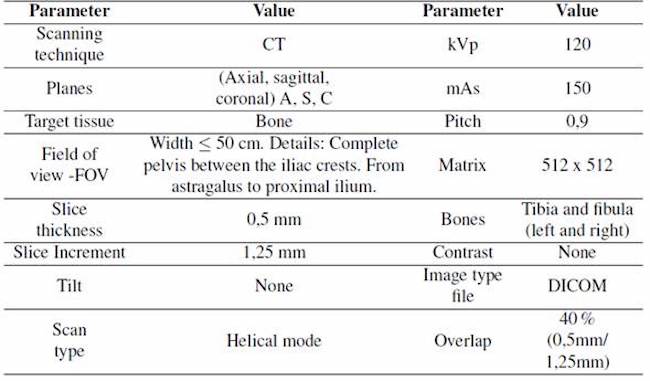 Tomography images were taken from an individual male, who was 25 years old and 1,82 m tall, with a weight of 80 kg and no reported pathologies. Before the image acquisition, the volunteer filled out an informed consent. He was chosen to be used in future studies since his results could be compared to previously collected data available in Opensim databases. The tomographic images were taken using the parameters shown in Table I, based on the CT scan protocol provided by Materialise [17].