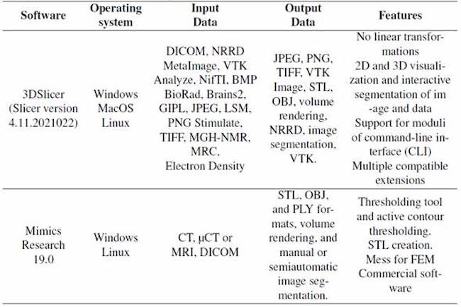 Two software applications with similar capabilities were selected because they were readily available for the study. The selected software was Mimics Research 19.0 (research license) and 3DSlicer (Slicer version 4.11.20210226, open source). The capabilities of the both applications are shown in Table II.
