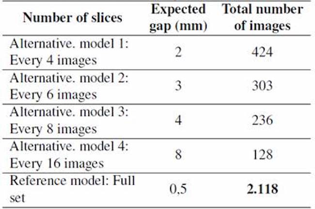 The total number of 2D cross-sectional images (slices) acquired during the CT scan was 2.118.After obtaining the data, the reference model was reconstructed. Alternative models were also reconstructed, creating gaps between the 2D slice files. Table III shows the different number of slices (retained slices from the reference model) used to reconstruct the alternative models. The model’s total number of images/slices considered the helicoidal scanning mode, and the same number was used for both software applications.