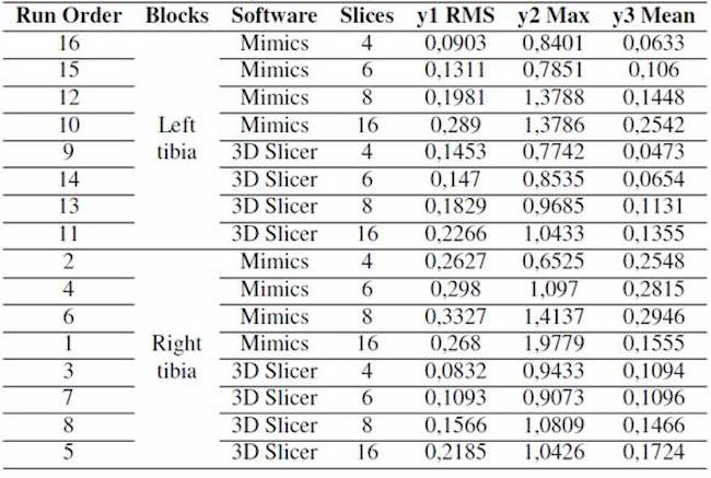 factorial design was used to analyze the effect of two factors: software and the number of slices in the RMS (root mean square), Max (maximum distance between meshes), and Mean distance responses. The responses were obtained via the Euclidean distance of the model with a reduced number of slices vs. the control (the model with the complete number of slices). The MeshLab software was used to calculate the Hausdorff distance, which refers to the maximum distance between two subsets of points, where one belongs to an x-mesh, and the other belongs to a y-mesh.MeshLab samples each point belonging to the x-mesh and takes the closest point of the y-mesh. Therefore, it is very important to perform a previous alignment process between the meshes as accurately as possible. It is also essential to take as many points as possible when applying the filter, which can be ensured by sampling the vertices, edges, and faces [18]. The software factor had two levels: Mimics and 3D Slicer. The number of slices factor had four levels: 4, 6, 8, and 16. The alternative reconstructed models were compared with the reference model, and the right tibia and left tibia were considered as replications. The experimental setup is shown in Table IV. Residual plots were used to test the normality, independence, and constant variance assumptions (data not shown). Outliers identified via scatter plots were extracted from the analysis. The incidence of the effects and two-level interactions was evaluated via ANOVA (p <0,05).