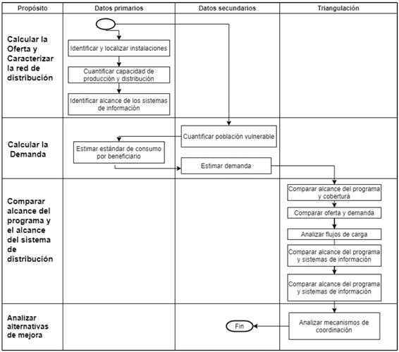 Por lo anterior, en el seguimiento del cumplimiento de las necesidades alimenticias de la población vulnerable, no es suficiente considerar el diseño adecuado de las propiedades nutricionales del complemento alimentario [3], sino también el conjunto de elementos y conexiones que hace posible la entrega efectiva del producto a la población, así como el seguimiento a la cobertura del sistema, el nivel de servicio, los costos de transporte y los tiempos de entrega. El diseño de la red de distribución permite vincular la manufactura con regiones geográficamente dispersas [19], mientras constituye el factor más importante para incrementar la capacidad de respuesta [20], mejorar los niveles de atención requeridos [21] y disminuir los costos totales [22], principalmente los costos de transporte e inventarios. De este modo, resulta pertinente analizar la estructura del sistema de distribución en programas de transferencias directas de alimentos y de esta manera hacer explícitas las relaciones que sus elementos tienen con la atención de la demanda en la población infantil vulnerable. Si bien se han realizado esfuerzos para medir el impacto de programas de asistencia nutricional e identificar el impacto que estos puedan tener sobre la seguridad alimentaria y la salud de la población beneficiaria, en dichos estudios no se han abordado explícitamente elementos del sistema de distribución y su relación con el cumplimiento de los objetivos de los diferentes programas. Por ejemplo, trabajos como los realizados por [23] han revisado diferentes métodos de medición de los efectos de diferentes tipos de programas para los Estados Unidos, los métodos revisados se enfocan en la salud del beneficiario y sus actividades diarias, pero no contemplan aspectos técnicos de la entrega de las ayudas. Otros estudios se han centrado en la revisión de diferentes escalas y métodos de medición de seguridad alimentaria en el mundo, los resultados muestran que los métodos se centran en las condiciones sociales, de ingesta de alimentos y de indicadores antropométricos en las poblaciones [24], pero no se contemplan los factores de los sistemas de distribución como los relacionados con el éxito de las políticas de seguridad alimentaria. En el contexto del aseguramiento de una adecuada nutrición en poblaciones urbanas, otros autores han contemplado factores referentes a la estructura del sistema de distribución y transporte. Por ejemplo, en [25] consideraron la capacidad de las vías o conexiones de transporte y el aseguramiento de la inocuidad de los alimentos mediante cadenas de frío en el transporte y la distribución, con el objetivo de mejorar la conectividad entre zonas urbanas y rurales. Por su parte, en [26] estudiaron el rol de los detallistas, quienes operan entre la interface de productores y consumidores. Adicionalmente, cumplen un rol crítico a la hora de aumentar la resiliencia de la producción y la oferta. Otros trabajos como los presentados en [27] hacen un llamado para un abordaje integrador entre disciplinas económico-adminsitrativas de la naturaleza y de la tecnología para abordar el problema de seguridad alimentaria desde la perspectiva de la cadena de valor. Siguiendo este enfoque el presente trabajo busca explorar las relaciones y la articulación entre los elementos del sistema de distribución y la eficacia del programa de Bienestarina Más® en Colombia, entendiendo eficacia como la capacidad de un programa humanitario para atender su demanda, reduciendo los faltantes y las entregas redundantes hacia la población beneficiaria [28], [29]. Para ello, en primer lugar se hace una síntesis de la metodología propuesta. Luego se presenta en detalle el caso de estudio, en donde se realiza una evaluación de: la cobertura geográfica de la infraestructura del programa, la coherencia entre la oferta y la demanda,la localización de instalaciones de almacenamiento y el plan de transporte. Finalmente, se realiza un diagnóstico con respecto al seguimiento de los usuarios y la trazabilidad de la carga.