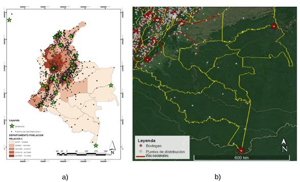 Con el fin de abastecer la demanda, el sistema de distribución se ha configurado con dos plantas de producción que envían la carga del complemento alimentario hacia 21 bodegas (Figura 2), desde las cuales se distribuye el producto a cerca de 5.000 puntos de entrega a nivel nacional (Figura 1). Los puntos de entrega a su vez se conectaron aproximadamente 112.000 unidades ejecutoras, las cuales a su vez suministran el producto para el consumo de los beneficiarios. También puede existir una conexión directa entre puntos de entrega y beneficiarios.