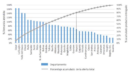 Para el caso analizado y a la luz de lo expuesto en los párrafos previos, vale la pena resaltar los resultados de las comparaciones entre oferta y demanda. La oferta fue obtenida a partir de los reportes oficiales y la demanda calculada mediante el procedimiento descrito anteriormente. Los resultados obtenidos para el programa no siempre muestran una coincidencia entre demanda y oferta.Como puede verse en la Figura 4, el análisis de Pareto muestra que la oferta no se encuentra concentrada en un pequeño número de departamentos, no obstante al menos 9 de los 32 departamentos reciben entregas por encima del 100% de la demanda estimada, mientras que 12 de ellos reciben asistencia por debajo del 60% de los requerimientos. Como consecuencia, la distribución presenta falencias propias de los esfuerzos de respuesta humanitaria en situaciones de desastre, mostrando sobresuministro y escasez al mismo tiempo, es decir que unas zonas reciben asistencia por encimade los requerimientos, mientras otras zonas se encuentran en faltante [29], [48]. Desde el punto de vista de la eficacia del sistema, la presencia simultánea de sobre suministro y faltante muestra las dificultades del sistema para hacer coincidir la oferta y la demanda.