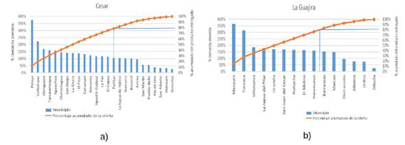 Un análisis desagregado por municipio sobre los dos departamentos que reciben proporciones más altas de suministro con respecto a su demanda estimada (Cesar y La Guajira) muestra que la existencia simultánea de sobresuministro y faltante se presenta también a nivel municipal. Algunos de sus municipios muestran escasez significativa, mientras otros tienen porcentaje de atención de hasta el 350% de su demanda estimada, como puede verse en la Figura 5.