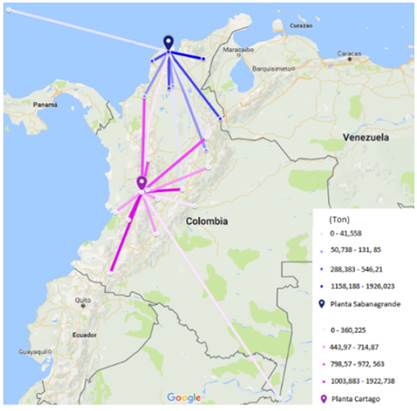 Para el caso analizado se graficaron los flujos de carga para el año 2015. Los flujos se originan en las plantas de producción y se enrutan hacia las bodegas regionales. En la Figura 6 se pueden observar los flujos de carga como líneas, las cuales se hacen más oscuras cuando la cantidad de carga aumenta.
