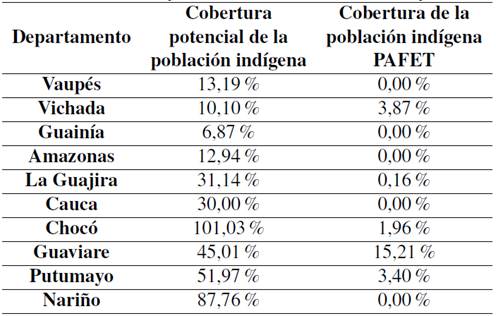 Regresando al análisis del Figura 4, se observaron 12 municipios con atención de la demanda por debajo del 60 %. De estos departamentos, 10 coinciden con alta presencia de población indígena y con las zonas de menor concentración de puntos de entrega vistos en la Figura 3. Con el fin de analizar las entregas en esos departamentos, la Tabla I. presenta la cobertura de la población indígena bajo el supuesto optimista de que el total de las entregas son asignadas a este grupopoblacional y luego son comparadas con el porcentaje de cobertura de las entregas por el programa de apoyo a familias de grupos étnicos (PAFET), el cual está diseñado para atender específicamente grupos poblacionales como las comunidades indígenas.