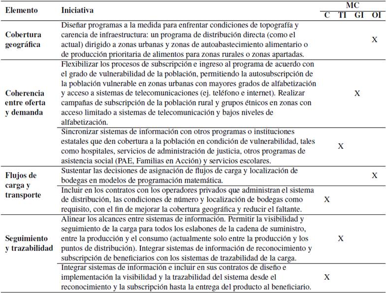 El análisis del sistema de distribución permite observar que las potenciales mejoras sobre la eficacia del programa de asistencia alimentaria analizado dependen de la coordinación de sus diferentes componentes, de tal manera que el alcance del programa sea coherente con las acciones realizadaspara satisfacer la demanda. En ese sentido, dentro de su objetivo de otorgar a la población vulnerable un complemento de alto valor nutricional, su alcance comprende los flujos financieros, de producto y de información de proveedores y fabricantes hasta el beneficiario. Las alternativas se basan en hacer consistentes los elementos del sistema de distribución y el alcance del programa tomando como punto de partida los hallazgos descritos en los apartes anteriores. Las orientaciones para el mejoramiento se clasifican de acuerdo con los mecanismos de coordinación propuestos en [64]: contratos, tecnologías de información, gestión de la información y otras iniciativas paracoordinación. Los contratos tienen el propósito de mejorar la gestión de las relaciones entre proveedores y clientes de un producto o servicio, reduciendo el riesgo y permitiendo compartir riesgos o beneficios entre las partes involucradas [65]. Las tecnologías de información ayudan a mejorar el vínculo entre los orígenes del suministro (proveedores, fábricas) y los consumidores, mientras que la gestión de información permite, entre otras, acordar voluntades de información compartida y facilitar la adquisición de datos interoperables con las tecnologías de información [64]. Otras iniciativas de colaboración, como el uso de modelos matemáticos en el diseño u operación del sistema de distribución, crean marcos de entendimiento entre las partes para sustentar los contratos o la toma de decisiones. La Tabla II resume las iniciativas o alternativas propuestas.