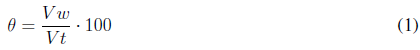 Los tratamientos se incubaron ajustando la humedad a capacidad de campo (θ) en cada UE [31], este factor ayuda a representar la dinámica de mineralización de N del suelo y tiende a incrementarse cuando la humedad del suelo se aproxima a capacidad de campo y ayuda a no inhibir el proceso de nitrificación [32]. El resultado de la humedad a capacidad campo fue 50,09 %, porcentaje característico de suelos con presencia de arcillas [33] y se determinó a partir de la Ecuación (1), donde V w corresponde al volumen de agua presente en la muestra (Vω) y volumen total de suelo (Vt).